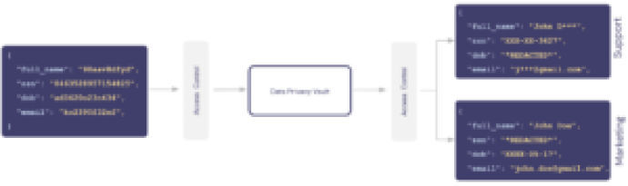 With roles and policies similar to ones above in place, the same de-identified data is exchanged with the vault. Based on the role and associated access control policies for the caller, different views of the same sensitive data can be supported.