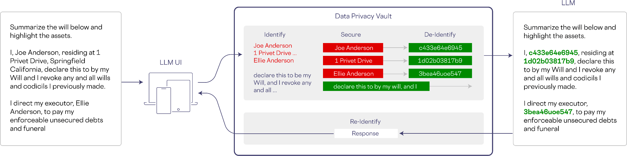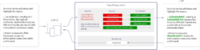 Sensitive data may also enter a model during inference. In the example below, a prompt is created asking for a summary of a will. The vault detects the sensitive information, de-identifies it, and shares a non-sensitive version of the prompt with the LLM.