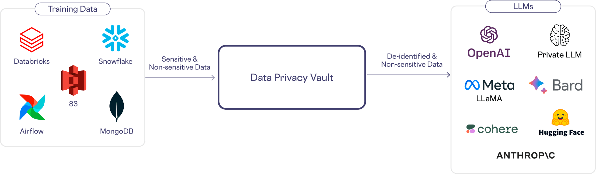 To preserve privacy during model training, the data privacy vault sits at the head of your training pipeline. Training data that might include sensitive and non-sensitive data goes to the data privacy vault first. The vault detects the sensitive data, stores it within the vault, and replaces it with de-identified data. The resulting dataset is de-identified and safe to share with an LLM.