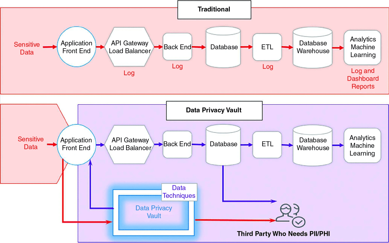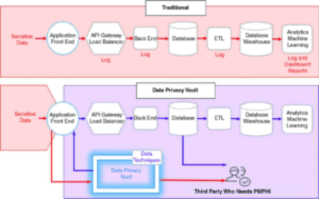 De-identification happens through a tokenization process. This is not the same as LLM tokenization, that has to do with splitting texts into smaller units. With data de-identification, tokenization is a non-algorithmic approach to data obfuscation that swaps sensitive data for tokens. A token is a pointer that lets you reference something somewhere else while providing obfuscation.Traditional data management versus a data privacy vault architec