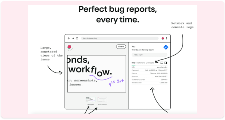 Jam is a browser extension that will instantly replay a bug while automatically attaching diagnostics: network requests and speed, console logs, device, and more – all in one easy click. You don’t have to log into a new tool or disrupt workflows, as Jam has direct integrations with all the first class bug reporting tools to seamlessly drop diagnostics into a ticket.
