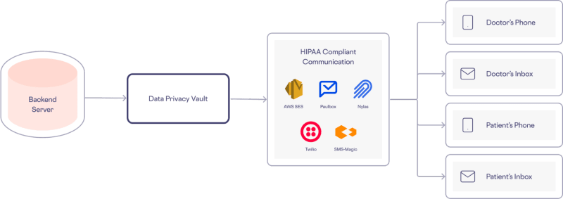 An example of this flow for sending HIPAA compliant forms of communication is shown below. The backend server calls the vault directly with tokenized data and the vault then shares the actual sensitive data with the third party communication service.