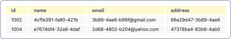 In the application database, we’ll have a table similar to the one shown below where the actual PII has been replaced by de-identified tokens.