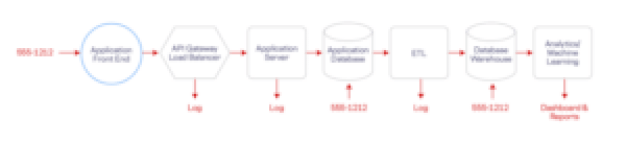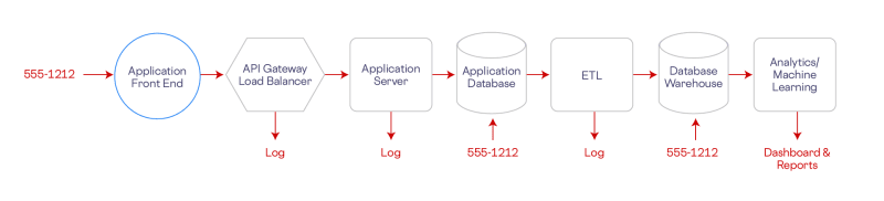 In the diagram below, which represents an abstraction of a modern system, a phone number is being collected in the front end of the application, perhaps during account creation. That phone number ends up being passed downstream through each node and edge of the graph and at each node, we potentially end up with a copy of the phone number.