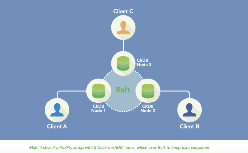 CockroachDB’s name was inspired by the popular image of the cockroach as the ultimate “survivor.” Disposability and high availability are integral to its design. Its Multi-Active Availability model is based on the Raft consensus algorithm, which requires three nodes to agree on a write’s contents to establish consistency (more on that later). As long as a majority of nodes agree, the data can be written- meaning that if any nodes are down, the request can still proceed as long as a quorum can be established. This makes the system robust to service outages while maintaining consistent data between nodes.