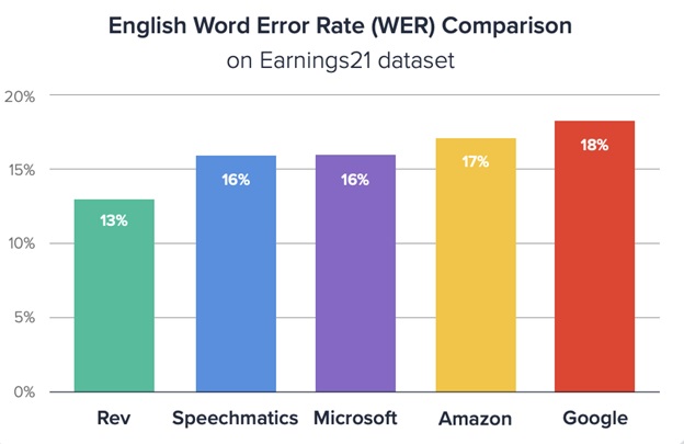 When Rev ran a publicly available, 39-hour unedited long-form audio dataset called Earnings-21 through FSTAlign, they found they had the lowest WER value compared to Google and Amazon, among other competitors.
