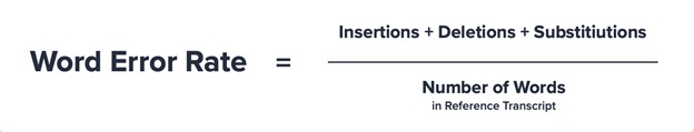 Different ASR vendors will use different benchmarking approaches to measure accuracy. The primary tool Rev uses, which they suggest you use too, is the Word Error Rate (WER). This gives a percentage of how many words the ASR got wrong. Failures include omitting the right word, inserting the wrong word, and incorrectly substituting one word in the place of another.