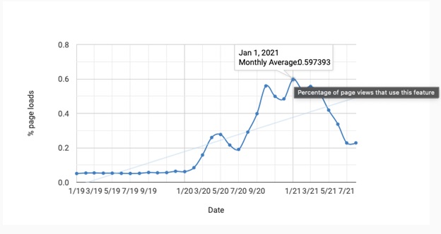 We can glance over the Chrome platform status; for this API (getUserMedia), you can see that the trend keeps going upwards! The slight downward trend can be attributed to the fact that offices started opening up – this isn’t necessarily indicative of the fact that WebRTC’s usage has gone down – remember, we are making a correlation-causation analogy here!
