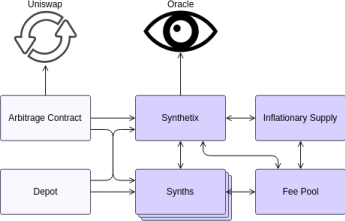 Synthetix is constructed on the Ethereum blockchain and has various differing ERC20 tokens and smart contracts. At a high level the base components of Synthetix is the base contract, ERC20 Synths and the various contracts surrounding them, arbitrage contracts and Uniswap, the inflationary pool, and the fee pool.