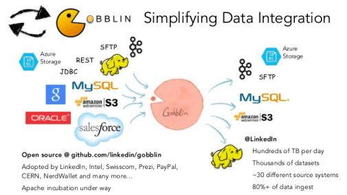 Complementing Kafka is a tool called Gobblin, a distributed data integration framework. Gobblin is used to ease and unify the integration of data between different sources and sinks, providing scalability, fault tolerance, and quality assurance in one tool. Developed initially to serve as an “uber-ingestion framework” for Hadoop at LinkedIn, Gobblin was open-sourced and donated to Apache where it has taken on new integrations and a diverse community of committers.