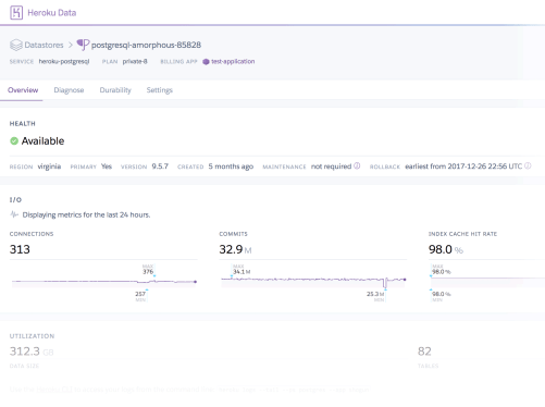 Heroku’s flagship data management offering is Heroku Postgres. PostgreSQL is an open-source relational database management system (RDBMS) that has been widely adopted since its release in 1996 due to its support for a wide variety of data types, its ACID-compliant transactions, and its use of write-ahead logging to increase fault tolerance. Heroku adopted Postgres in 2007, and it continues to be the most popular data storage offering on the platform. Heroku Postgres allows users to manage schema migrations, database access controls, and scaling from the Heroku platform. A Heroku Postgres database can be shared between several applications by a simple set of commands from the CLI. Heroku Postgres has a feature called rollback, which acts like a time machine for the database, allowing a developer to “roll back” the database to a previous point in time without affecting the present state of the database.