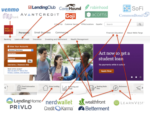This shows the traditional Wells Fargo online banking screen, overlaid with Fintech companies that are building whole businesses around providing the highlighted services. Each of these companies has specialized to provide a service which is offered as part of an aggregated customer experience. Intuition might suggest that a focused, specialized company might outcompete the Wells Fargos of the world attempting to provide a broad menu of services, but Wells Fargo still retains over $1.7 trillion in deposits, compared to just over $1billion for the biggest “challenger bank,” N26.