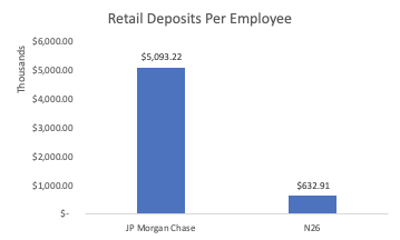 Author’s calculations, using $1 billion in deposits versus 1580 employees for N26; $1.3 trillion in deposits versus 250,000 employees for JP Morgan Chase. This is necessarily an imperfect comparison due to different depositor profiles (primarily individuals for N26 versus individuals and businesses for JP Morgan), but a detailed breakdown is beyond the scope of this article.