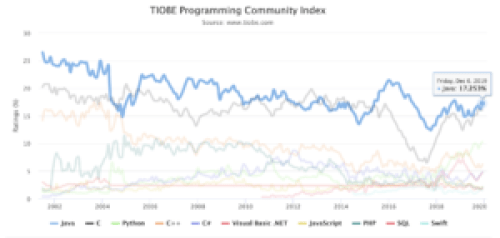 The first public implementation of Java was released in 1996, when the Nintendo 64 was at the cutting edge of game console technology and 41% of web users regularly accessed AOL.com. The intention of its creators was to provide cross-platform functionality for applications distributed via the then-nascent World Wide Web- known as applets– a feature completely removed from Java in 2018. Yet despite the removal of its original use from the language, Java remains the #1 programming language in the annual TIOBE index, a position it has held with only brief interruptions from C since the beginning of the 21st century.