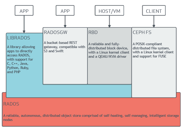Ceph’s architecture is complicated, with a multitude of underlying technologies such as RADOS, librados, RADOSGW, RDB, its CRUSH algorithm, and components like monitors, OSD, and MDS. Without delving into its architecture, the key point to take is, Ceph is a distributed storage cluster that makes scalability much easier, eliminates single points of failure without sacrificing performance, and provides a unified storage with access to object, block, and file.