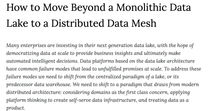 Data mesh represents the movement away from having a centralized data lake that all teams interact with, and towards having different data products and individual data management systems for individual domain teams.