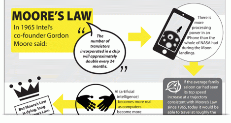 Moore’s Law states that the number of transistors in a dense integrated circuit double about every two years. Moore’s Law is less like a “law” and more like an observation or a