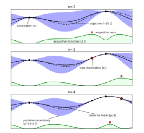 Bayesian optimization through 3 iterations for an argmax task, from Taking the Human Out of the Loop: A Review of Bayesian Optimization by Shahriari et. al.