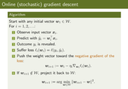 An intuitive example to this online learning setting is very well-known in the neural network area: stochastic or online gradient descent. Typically used during the optimization step of neural networks, gradient descent is an algorithm that aims to minimize a target function by iteratively moving in the direction of steepest descent as defined by the negative of the gradient.
