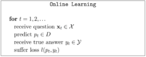 Online learning is performed in consecutive rounds denoted by t, where in each round the learner receives a question xt, and subsequently provides an answer pt. When the true answer is received, the learner suffers a loss, and the learner can update the model accordingly.