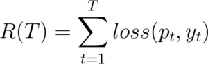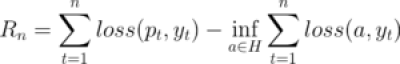 where pt and yt are as described above. The overall goal is to minimize regret, a different notion of cumulative loss. Regret is defined as