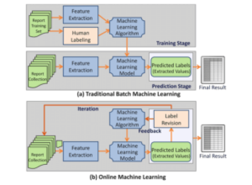 Online machine learning versus batch learning. (a) Batch machine learning workflow; (b) Online machine learning workflow, from Zheng et.al. Effective Information Extraction Framework for Heterogeneous Clinical Reports Using Online Machine Learning and Controlled Vocabularies