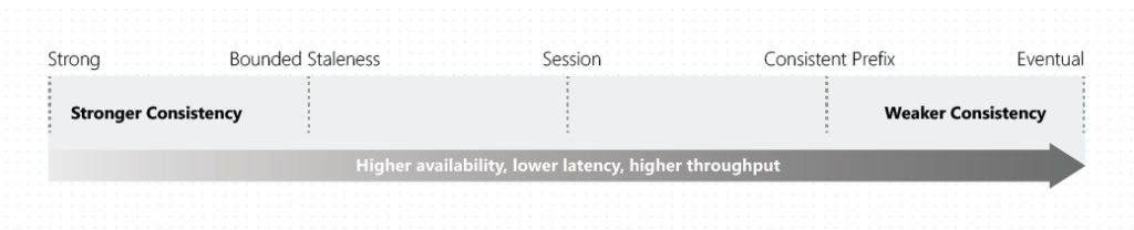 Through several consistency levels, Cosmos DB lets developers decide the trade-offs that they want to make with appropriate SLAs. Instead of the two extreme ends of strong consistency and eventual consistency, there are five well-defined consistency levels alongside the spectrum. Each consistency level comes with a separate SLA, ensuring certain levels of availability and performance.