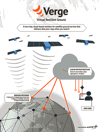 Lockhead Martin’s Verge is a Virtual Resilient Ground that works side-by-side with AWS. Verge provides low-cost antennas that are connected to AWS network and are able to download data down to earth and move it into AWS cloud.