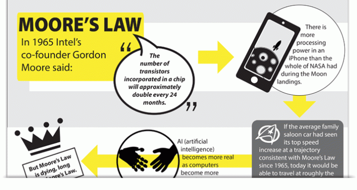 Moore’s Law states that the number of transistors in a dense integrated circuit double about every two years. Moore’s Law is less like a “law” and more like an observation or a prediction.