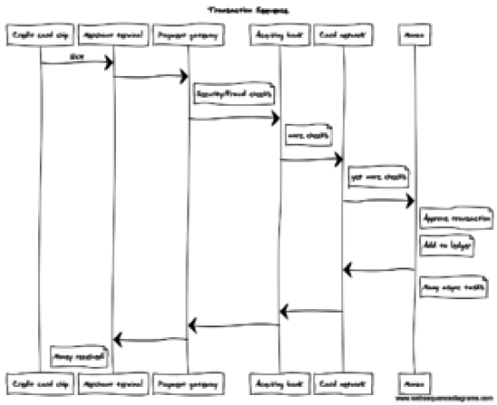 Richard describes the tortuous path a transaction makes from merchant point to the customer’s bank, which can be summarized in the following diagram: