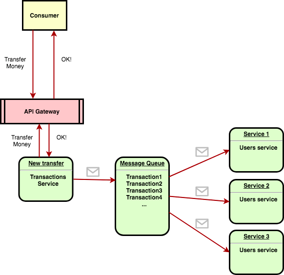 Asynchronous communication happens for tasks that are not of interest to the end consumer: for example transferring the new event to a data science engine. This communication is performed by queueing a message on Kafka queue, which every relevant service that needs the data listens to.