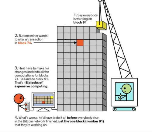 Proof of Work (PoW) requires miners to go through an intense race of trial and error to find the nonce for a block; blocks with a valid nonce can be added to the chain. This process can be very energy intensive. The security of this model is that miners are not incentivized to start their own chain because it undermines the system (no pun intended). Here’s a visual representation of the security model for Bitcoin as the example blockchain: