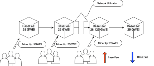 EIP 1559 introduces two new concepts: the BaseFee and the Miner tip. The BaseFee is the minimum fee required for a transaction to be included in a block; this fee can be adjusted per block(+/- 12.5% the previous block’s fee) based on network congestion of Ethereum; the reasoning for the adjustment is to allow the network to reach equilibrium by accommodating for network utilization. The miner tip is a separate fee that can be paid to incentivize miners to prioritize a transaction. There is also the introduction of larger block sizes, setting the max capacity to 25M GWEI from 12.5M GWEI previously.