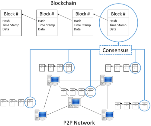 Blockchain: a cryptographically secure distributed ledger system with a shared state in which each state is dependent upon the previous one, making it difficult to modify the previous state.